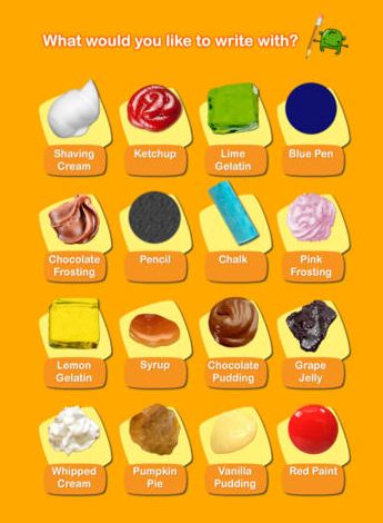 Another app you like is Touch and Write which we have on the iPad. This app is brilliant as we’ve programmed in a list of words ourselves – your name, family names etc. – and you love writing the letters in the words and then popping the bubbles at the end. There are also lists of common words, and letters and number shapes for you to draw over. You love choosing different things to write with – shaving foam, chocolate sauce, lime jelly, ketchup etc.